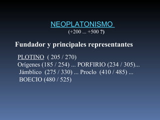 El neoplatonismo fue una escuela filosófica y religiosa fundada por Plotino en el siglo III d.C. que buscó sintetizar las ideas metafísicas de Platón, especialmente su teoría de las formas. El neoplatonismo enseñaba que la realidad última es "lo Uno", del cual emanan distintos planos ontológicos hasta llegar al mundo material. El objetivo del ser humano es purificar el alma a través de la contemplación para ascender y unirse de nuevo con lo divino.
