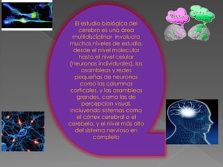 Las neurociencias estudian la estructura, función, desarrollo, bioquímica, farmacología y patología del sistema nervioso y cómo sus elementos interactúan para dar lugar a las bases biológicas de la conducta. Las neurociencias se combinan con la psicología para crear la neurociencia cognitiva, una disciplina inicialmente dominada por psicólogos cognitivos. El estudio del cerebro es multidisciplinario e involucra diferentes niveles, desde el molecular hasta el sistemas nerviosos completos.
