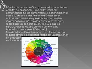 Las redes de comunicación se han vuelto más rápidas y pueden soportar más usuarios conectados al mismo tiempo. Cada vez más actividades diarias como reservas de viaje, pagos y compras se realizan en línea. La web ha evolucionado para dar a los usuarios un papel más activo al acceder e interactuar con los contenidos.