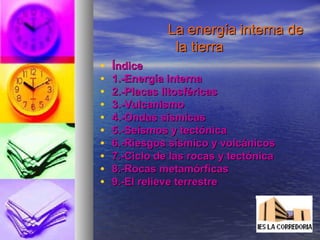 Este documento describe la energía interna de la Tierra. Explica que la energía interna causa los movimientos de las placas tectónicas, lo que da lugar a procesos como el vulcanismo y la sismicidad. También describe cómo la energía interna conduce a la formación y transformación de rocas a través del ciclo de las rocas y el metamorfismo.