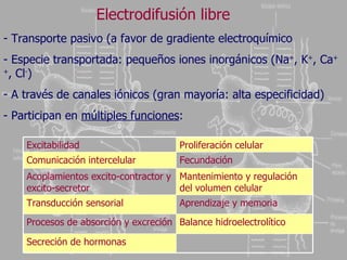 El documento describe los diferentes mecanismos de transporte iónico a través de la membrana celular, incluyendo la electrodifusión libre a través de canales iónicos. Explica que la electrodifusión ocurre de forma pasiva siguiendo el gradiente electroquímico, y que los canales iónicos confieren alta especificidad al transporte de iones como Na+, K+, Ca++ y Cl-. También presenta las ecuaciones que rigen este proceso, como la ley de Nernst y la ecuación de Goldman-Hodgkin-Katz para