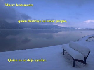 El documento enfatiza que la vida se apaga lentamente en aquellos que no viajan, no sienten emociones, y se conforman con la rutina. Insta a arriesgarse y buscar la felicidad a través de nuevas experiencias y pasiones. Se presenta como un llamado urgente a vivir plenamente y no dejarse llevar por el hábito y la resignación.