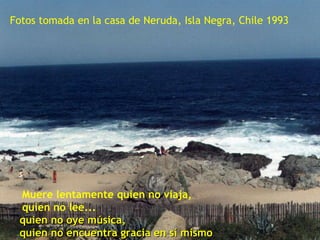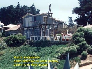 Este documento ofrece consejos para evitar morir lentamente. Indica que las personas mueren lentamente si no viajan, leen o escuchan música. También si destruyen su amor propio, se convierten en esclavos de los hábitos o evitan las pasiones y emociones. Exhorta a vivir el presente, arriesgarse, seguir los sueños y no dejarse impedir ser feliz.
