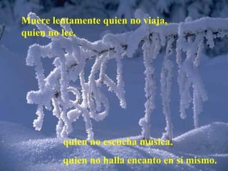 Este documento habla sobre las formas en que una persona puede morir lentamente. Menciona que alguien muere lentamente si no viaja, no lee, no escucha música o no se acepta a sí mismo. También dice que alguien muere lentamente si repite la misma rutina diaria sin cambiar o arriesgarse a probar cosas nuevas. Finalmente, el documento enfatiza la importancia de vivir el presente, arriesgarse y ser feliz en lugar de dejarse morir lentamente.