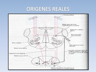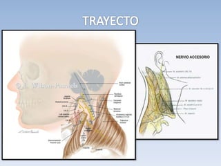 El documento describe el nervio accesorio craneal y espinal. El nervio accesorio craneal es exclusivamente motor y controla los músculos de la laringe. Se origina en el núcleo bulbar y la médula espinal desde el bulbo hasta el quinto mielómero cervical. El nervio accesorio espinal inerva los músculos esternocleidomastoideo y trapecio de la cabeza.