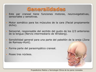 Este documento resume las características del nervio facial (VII par craneal), incluyendo sus funciones motoras, sensoriales y parasimpáticas. Describe la ubicación de sus tres núcleos y su trayecto desde el tronco encefálico hasta la cara. Explica cómo explorar posibles alteraciones como la parálisis facial y establece que la lesión es ipsilateral a la parálisis.