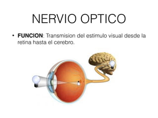 El documento describe la anatomía y función del nervio óptico. El nervio óptico transmite los estímulos visuales desde la retina hasta el cerebro, originándose realmente en las células ganglionares de la retina. El nervio pasa por la órbita y el conducto óptico, entrando a la fosa craneal media donde forma el quiasma óptico, donde las fibras se entrecruzan. Luego continúa como el tracto óptico hasta los cuerpos geniculados laterales del tálamo y las cortezas visuales en los l