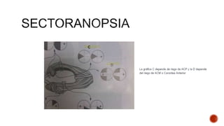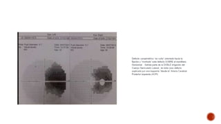 El documento resume los cuatro aspectos de la exploración del nervio óptico: 1) agudeza visual de lejos y cerca, 2) perimetría y campimetría, 3) visión de colores, y 4) examen del fondo de ojo. También describe pruebas como la tabla de Snellen, tabla de Jaeger y prueba de sensibilidad al contraste que son útiles para evaluar condiciones como la catarata. Finalmente, clasifica las alteraciones de la visión de colores como congénitas o adquiridas y menciona algunas afecciones como