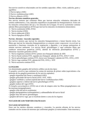 Este documento describe los 12 pares de nervios craneales, incluyendo sus componentes funcionales, clasificación, ganglios asociados y núcleos en el encéfalo. Resume las características de los nervios craneanos, destacando que transportan fibras aferentes y eferentes, y que inervan estructuras de la cabeza, cuello y tórax. También describe brevemente el nervio olfatorio, sus neuronas receptoras y conexiones en el bulbo olfatorio.