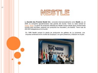 Nestlé es la compañía agroalimentaria más grande del mundo con sede en Suiza. Ofrece una amplia gama de productos que incluyen agua mineral, comida para animales, chocolate y lácteos. En 1996, Nestlé compró una planta de producción de galletas en Guayaquil, Ecuador. Algunas de sus principales marcas a nivel internacional son bebidas, chocolates, galletas y dulces, y quesos y yogures.