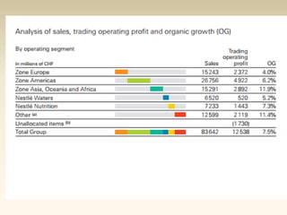 El documento presenta una descripción general de Nestlé, incluyendo su historia desde 1866, su misión, valores y operaciones a nivel global. Describe su modelo de negocios con segmentación de mercados, propuesta de valor, canales de distribución, y recursos y actividades clave. También presenta información sobre sus operaciones en México y controversias.
