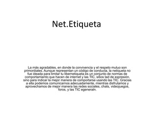 La netiqueta es un conjunto de normas de comportamiento para hacer de Internet y las tecnologías de la información y comunicación (TIC) sitios agradables donde prima la convivencia y el respeto mutuo, aunque representan un código de conducta, la netiqueta no fue creada para limitar la libertad de expresión sino para indicar la mejor manera de comportarse usando las TIC para comunicarnos adecuadamente mientras disfrutamos de las redes sociales, chats, videojuegos y foros.