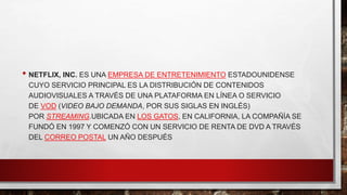 Netflix es una empresa estadounidense de entretenimiento fundada en 1997 que ofrece contenido audiovisual a través de un servicio de streaming. Comenzó ofreciendo alquiler de DVD a través del correo postal y su fundador Reed Hastings tuvo la idea después de recibir una multa al devolver tarde una película alquilada. Actualmente, Netflix es un servicio global de streaming que ofrece series, películas y otros contenidos.