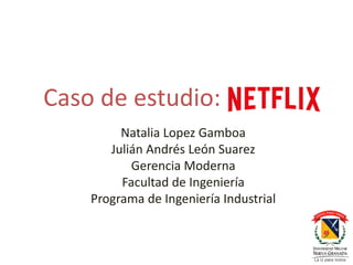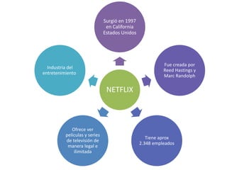 El documento presenta un caso de estudio sobre Netflix. Resume que Netflix surgió en 1997 en California y ofrece ver películas y series de forma ilimitada. Su visión es convertirse en el mejor servicio de entretenimiento global y su misión es ofrecer un servicio estelar a clientes y socios valiosos a proveedores. Analiza su estructura organizacional, factores de éxito, amenazas, competencia y presenta un plan estratégico para incrementar suscripciones y cobertura geográfica.