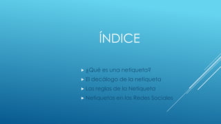 El documento habla sobre las reglas básicas de comportamiento en internet conocidas como netiqueta. Explica que la netiqueta surgió en 1994 con el libro "NETiquette" que estableció 10 reglas como no escribir en mayúsculas, respetar el tiempo de los demás y compartir conocimiento. También presenta reglas específicas para redes sociales como pedir permiso antes de etiquetar o publicar fotos de otras personas.