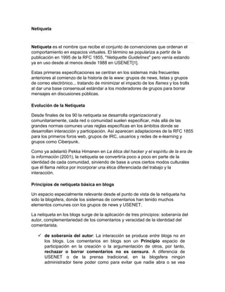 El documento describe la evolución de la netiqueta. Originalmente se centró en establecer normas de comportamiento para grupos de noticias y correo electrónico. Luego, cada comunidad en línea desarrolló sus propias reglas específicas. Un área importante fue la blogsfera, donde los principios clave fueron la soberanía del autor del blog, la complementariedad de los comentarios y la veracidad de la identidad del comentarista. Finalmente, se proporcionan recomendaciones básicas para el uso del correo electrónico centradas en