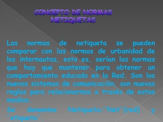 Las normas de netiqueta establecen reglas de comportamiento educado en Internet, como el uso de un nombre de usuario adecuado y firma breve en los mensajes. Se debe redactar bien los correos y mensajes, con un título informativo de al menos 4 palabras e indicar formalidad según el contexto. Al usar foros y grupos de noticias, tomar en cuenta la difusión del mensaje y evitar transmisiones innecesarias.