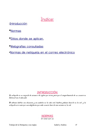 Las reglas de la netiqueta establecen un conjunto de normas para garantizar un comportamiento adecuado en Internet. Las 10 normas principales incluyen tratar a los demás con respeto, adaptarse al medio en que se navega y colaborar aportando información útil. La netiqueta se aplica en sitios como correo electrónico, foros, blogs y chats.