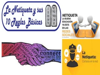El documento habla sobre la netiqueta y provee reglas para tener un comportamiento adecuado en internet y redes sociales. Define la netiqueta como un conjunto de normas para promover el respeto mutuo en las TIC. Luego, explica reglas de netiqueta generales como tratar a los demás con respeto y seguir los mismos estándares que en la vida real. También cubre reglas específicas para Facebook, Twitter y correo electrónico enfocadas en la privacidad, el contenido compartido y la interacción con otros.