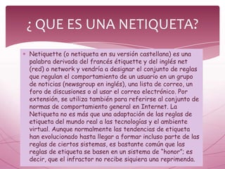 La netiqueta se refiere a las reglas de comportamiento para interactuar en internet de forma respetuosa. Incluye normas para el correo electrónico, las listas de correo, los foros de discusión y el chat. Algunas reglas clave son escribir de forma respetuosa, no usar mayúsculas, respetar el tiempo y espacio de los demás, y ayudar a mantener conversaciones educativas y constructivas.