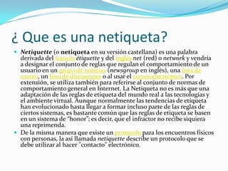 La netiqueta se refiere a las reglas de comportamiento en Internet. Surge de adaptar las normas de etiqueta del mundo real al entorno virtual. Incluye comportamientos adecuados en correo electrónico, foros, blogs y chats. Originalmente, las redes estaban limitadas a la investigación académica, pero con el tiempo surgieron problemas por usuarios ofensivos, lo que llevó al establecimiento formal de la netiqueta en 1995.