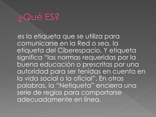 La "Netiqueta" se refiere a las reglas de comportamiento adecuado en línea. Incluye seguir la regla de oro de tratar a los demás como quisieras ser tratado, observar antes de participar en un nuevo espacio en línea, y asegurarse de que las comunicaciones en línea sean útiles y respetuosas del tiempo de los demás.