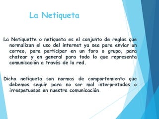 Este documento presenta las reglas básicas de la netiqueta para comunicarse de manera efectiva y respetuosa en internet. Explica que la netiqueta establece normas para el uso apropiado del correo electrónico, los foros y grupos en línea. Algunas de las pautas clave incluyen escribir mensajes de correo breves y en un tono de voz respetuoso, incluir un asunto descriptivo, y leer las normas de cualquier foro antes de participar para respetar las expectativas de esa comunidad.