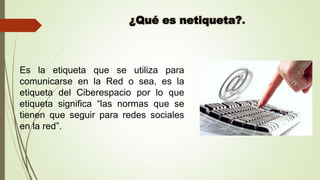 El documento describe las normas básicas de etiqueta en Internet, incluyendo mostrar respeto hacia otros, controlar las emociones, y evitar el uso excesivo de mayúsculas u ofensas. Se enfatiza la importancia de recordar que hay personas reales del otro lado y de comportarse de una manera honesta y respetuosa para fomentar interacciones saludables.