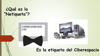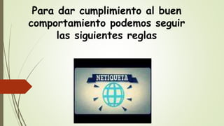 Este documento presenta 10 reglas básicas de etiqueta en internet, o "netiqueta". Estas reglas incluyen tratar a otros con respeto y compasión, seguir los mismos estándares de comportamiento que en la vida real, respetar el tiempo y ancho de banda de los demás, compartir conocimiento de forma ética, y respetar la privacidad de los demás. La "netiqueta" varía según el sitio web, por lo que es importante conocer las normas de cada comunidad en línea.