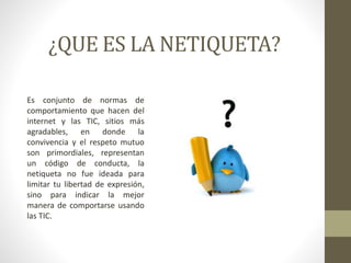 La netiqueta es un conjunto de normas de comportamiento para hacer de Internet y las tecnologías de la información y comunicación sitios más agradables donde prima el respeto mutuo. Las normas incluyen tratar a los demás con respeto, evitar escribir en mayúsculas para no gritar, respetar el tiempo y ancho de banda de los demás, y compartir conocimiento de forma educativa. La netiqueta busca promover la convivencia en línea y no limitar la libertad de expresión.