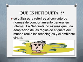 Este documento presenta una introducción a la netiqueta, que son las normas de comportamiento en Internet. Define la netiqueta como las reglas de etiqueta adaptadas al entorno virtual. Luego enumera ocho reglas básicas de netiqueta: 1) ser considerado con los demás, 2) seguir los mismos estándares de comportamiento que en la vida real, 3) conocer el contexto en línea donde uno se encuentra, 4) respetar el tiempo y ancho de banda de los demás, 5) comportarse adecuadamente en línea, 6) respetar la priv