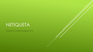 La netiqueta es un conjunto de normas de comportamiento que promueven la convivencia y el respeto mutuo en internet y las TIC. Aunque no existe una policía que haga cumplir estas normas, se han desarrollado a través de la comunicación colectiva para hacerla más efectiva, clara y respetuosa. La netiqueta incluye tips básicos como saludar, despedirse con amabilidad, revisar la ortografía, tomarse tiempo ante situaciones molestas y respetar la privacidad de los demás.