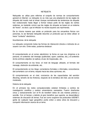 La netiqueta se refiere a las normas de comportamiento en Internet y es una adaptación de las reglas de etiqueta del mundo real al entorno virtual. Incluye comportamientos adecuados en correo electrónico, foros, blogs y chats, como tratar a otros con respeto, evitar spam y contenidos inadecuados. Surge a mediados de los años 90 ante los primeros problemas entre usuarios, cuando se elaboró el primer documento para regular las comunicaciones en la red.