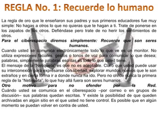 Este documento presenta 10 reglas básicas de la "netiqueta" o etiqueta en internet. Las reglas incluyen: 1) tratar a otros con respeto aunque no se pueda ver su rostro, 2) seguir los mismos estándares de comportamiento que en la vida real, y 3) saber en qué contexto o comunidad online se está interactuando porque las normas varían.