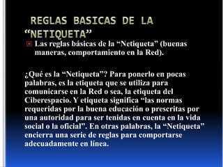 Este documento presenta 10 reglas básicas de la "netiqueta" o etiqueta adecuada para comunicarse en internet. Estas reglas incluyen tratar a los demás con respeto, seguir los mismos estándares de comportamiento que en la vida real, y ser consciente de que las normas pueden variar en diferentes espacios en línea. Otras reglas son respetar el tiempo y ancho de banda de los demás, aprovechar el anonimato para comunicarse sin prejuicios, compartir conocimiento, y mantener la privacidad y derechos de