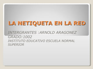 La netiqueta proporciona reglas para una conducta educada y respetuosa en internet. Incluye normas como escribir de forma clara y concisa, usar buena ortografía y puntuación, ser respetuoso con otros usuarios, y respetar las normas de cada foro o comunidad en línea. Siguiendo estas reglas se crea un ambiente en el que todos pueden disfrutar de sus interacciones en internet.