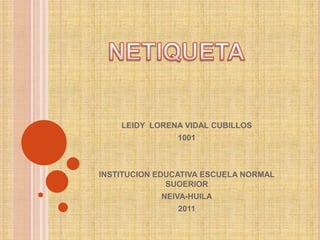 Este documento resume las normas de netiqueta o etiqueta en Internet. Explica que la netiqueta son reglas para regular la conducta de los usuarios en Internet y proporciona ejemplos como el comportamiento apropiado en correo electrónico, foros, blogs y chats. Además, destaca que el libro de Virginia Shea publicado en 1994 contiene 10 reglas básicas de netiqueta como tratar a las personas con respeto, seguir las mismas normas que en la vida real y compartir conocimiento de forma educativa.