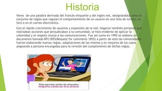 La netiqueta se refiere a las reglas de comportamiento para comunicarse en internet. Surge de la necesidad de aplicar la cortesía y el respeto mutuo en las comunicaciones en línea a medida que más personas accedían a la red. En 1995, el RFC1855 estableció las primeras pautas formales de netiqueta. Desde entonces, las comunidades han elaborado y adaptado reglas específicas para diferentes dominios en línea, a menudo asignando moderadores para hacer cumplir dichas reglas.