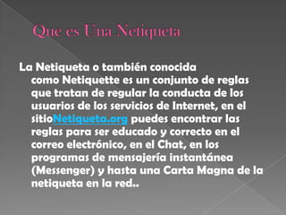 La Netiqueta o etiqueta en Internet es un conjunto de reglas que regulan la conducta de los usuarios en los diferentes servicios de Internet. Estas reglas buscan promover interacciones educadas y correctas en correo electrónico, chats, mensajería instantánea y otras plataformas. Cada servicio tiene sus propias normas de comportamiento que deben seguirse para mantener buenas relaciones con otros usuarios.