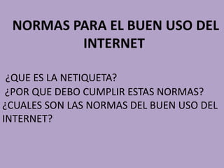 Este documento presenta 10 normas para el buen uso del internet. Estas normas incluyen tratar a otros con respeto, observar las normas y costumbres de cada sitio web, escribir de forma correcta, ayudar a otros de manera amable, participar solo cuando se tenga algo que aportar a una conversación, respetar la privacidad de otros, no juzgar los errores de otros, evitar el spam, respetar el tiempo de los demás, y leer la documentación antes de pedir ayuda.