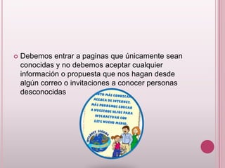 Este documento ofrece normas y recomendaciones para el uso adecuado y seguro de Internet, incluyendo no compartir información personal con desconocidos, establecer reglas claras para el uso y el tiempo en línea, supervisar el contenido que ven los niños y ayudarles a evaluar la información encontrada.