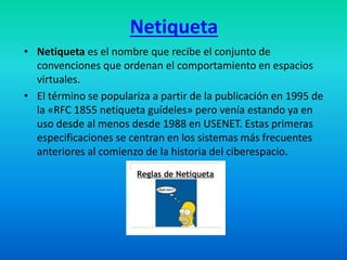 El documento habla sobre la netiqueta, que son las convenciones de comportamiento en espacios virtuales. Explica que la netiqueta se desarrolló a partir de 1995 y se ha adaptado a diferentes redes y comunidades. En los blogs, la netiqueta se basa en tres principios: la soberanía del autor del blog, la complementariedad de los comentarios, y la veracidad de la identidad del comentarista.