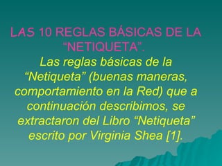 Este documento presenta un resumen de 10 reglas básicas de la "netiqueta" o etiqueta en internet. La primera regla es recordar que hay personas reales detrás de las pantallas. La segunda es seguir los mismos estándares de comportamiento que en la vida real. Y la tercera es conocer el contexto o lugar en internet donde uno se encuentra para saber qué es aceptable.