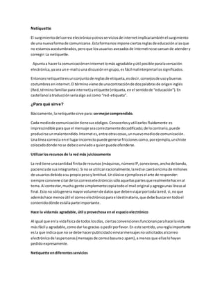 La netiquette es un conjunto de reglas de etiqueta o buenas costumbres para comunicarse en Internet. Sirve para ser mejor comprendido al conocer y usar los códigos de cada medio, evitar malentendidos. También ayuda a usar los recursos de la red de forma racional para que no se sature, y hace la interacción en línea más agradable al respetar la privacidad de otros usuarios.