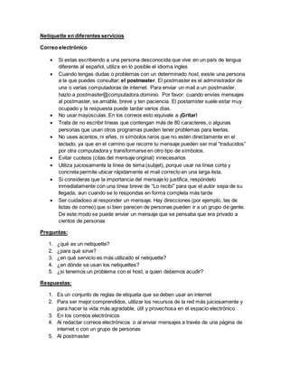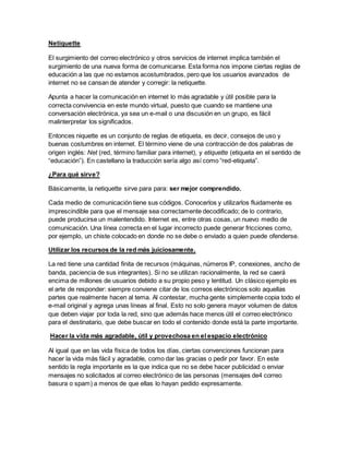 El netiquette es un conjunto de reglas de etiqueta para comunicarse en internet. Su objetivo es hacer la comunicación en línea más agradable y útil mediante una correcta interpretación de los mensajes y un uso racional de los recursos de la red. Algunas de estas reglas incluyen no usar mayúsculas ni citar mensajes completos, ser breve y claro en el asunto del correo electrónico, y contactar al postmaster del host en caso de problemas técnicos.