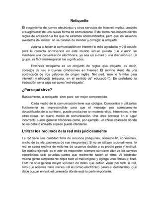 Netiquette es un conjunto de reglas de etiqueta para comunicaciones en Internet que apuntan a hacerlas más agradables, útiles y evitar malentendidos. Sirve para ser mejor comprendido al usar los códigos de comunicación adecuados en cada medio. También ayuda a usar los recursos de Internet de forma más racional para evitar que la red colapse bajo su propio peso. El postmaster es el administrador de una computadora de Internet a quien se puede consultar en caso de problemas.
