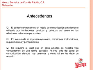 El documento presenta las pautas de netiqueta adoptadas por Wenco Servicios de Comida Rápida para promover un uso adecuado y respetuoso del correo electrónico. Se ofrecen recomendaciones sobre el envío de mensajes, incluyendo consejos sobre destinatarios, asunto, cuerpo del mensaje, anexos, firma y consideraciones generales. El objetivo es fomentar las buenas maneras en las comunicaciones electrónicas de la empresa.