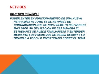 Netvibes es una herramienta web que permite a los usuarios organizar y acceder a información de diferentes sitios web en una sola ventana. Funciona mediante módulos y widgets que muestran contenido actualizado de páginas como blogs, canales de YouTube y periódicos. Los usuarios pueden personalizar Netvibes agregando solo las fuentes que les interesan para mantenerse actualizados fácilmente sobre temas específicos.