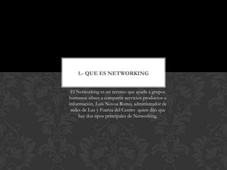 Este documento trata sobre el tema de networking. Explica que existen dos tipos principales de networking y la importancia de fidelizar a las personas en nuestra red de contactos conociendo sus intereses y fechas importantes. También define la expresión "el mundo es un pañuelo" como promover activamente contactos e intercambios, y la ley de retornos creciente como que cuanto más contactos de valor tiene una persona, más querrán conectarse con ella.