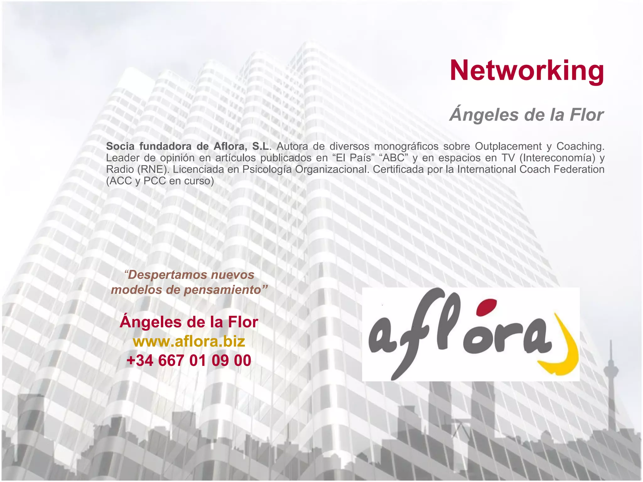 Ángeles de la Flor es la fundadora de Aflora, S.L., y experta en coaching y outplacement, con artículos publicados en medios de comunicación. El documento enfatiza la importancia del networking para el desarrollo personal y profesional, definiendo estrategias para gestionar contactos y alcanzar objetivos. Propone clasificar los contactos en 'cálidos' y 'puente', destacando la necesidad de escuchar y validar mensajes para expandir redes profesionales.